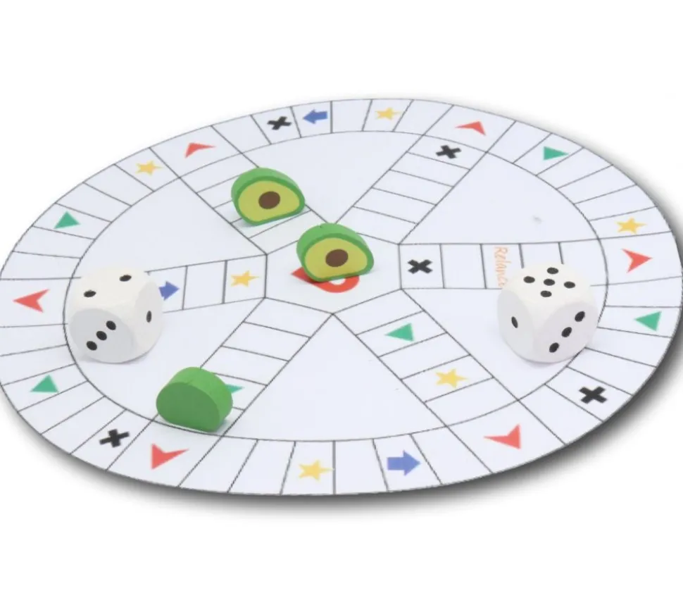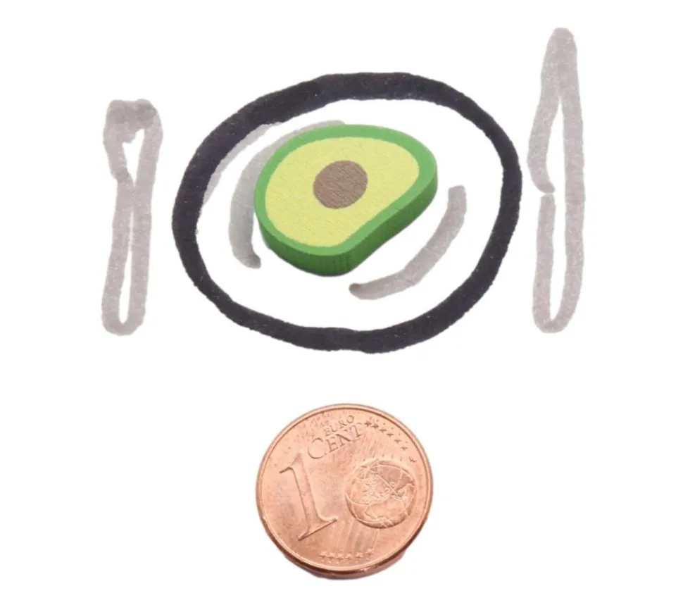 Jeton coloré avec une face avec coupe de l’intérieur de l’avocat tranché, où on distingue bien le noyau, la chair et la peau avec de belles couleurs, le recto est uni vert comme la peau de l’avocat. Accessoire de maison de poupées ou en décoration de jeu de construction.