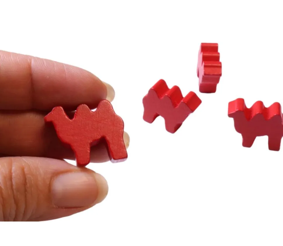 Pion de jeu forme animal ici le Chameau. Pion tout en bois teinté uni en couleur à choisir parmi rouge ou bleu.