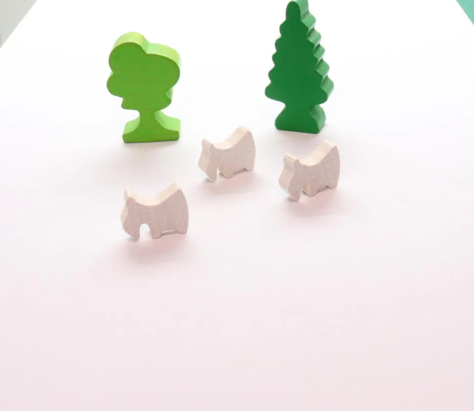 Pion de jeu en bois en forme de chèvre à poil long. Un bouc ou une petite biquette pour vos jeux de société.