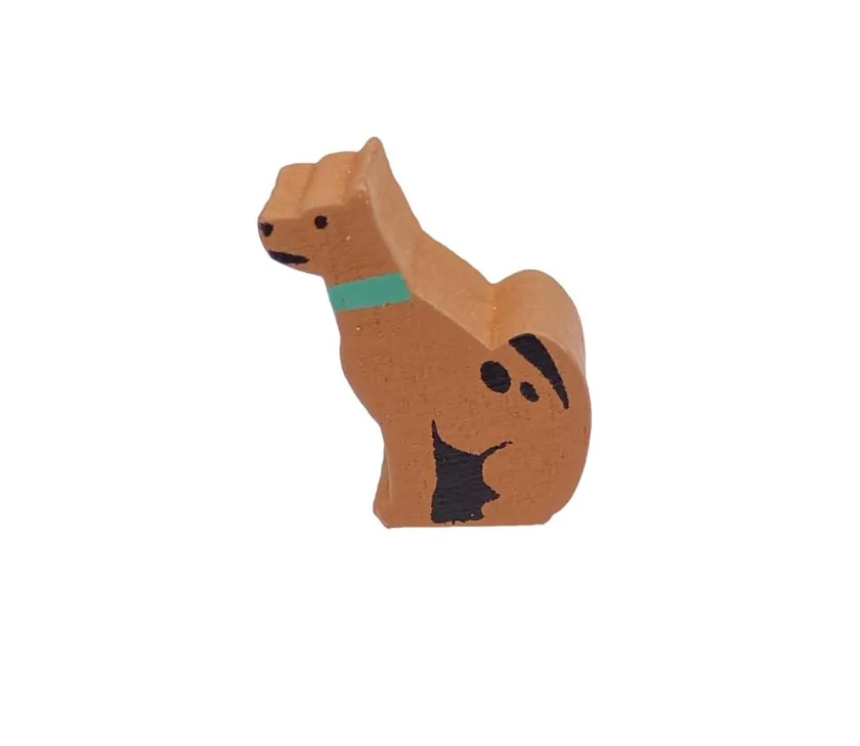 Pion en bois chien assis de couleur marron avec traits de détail peints comme le collier vert, le museau, les yeux, les tâches de pelage, les pattes…