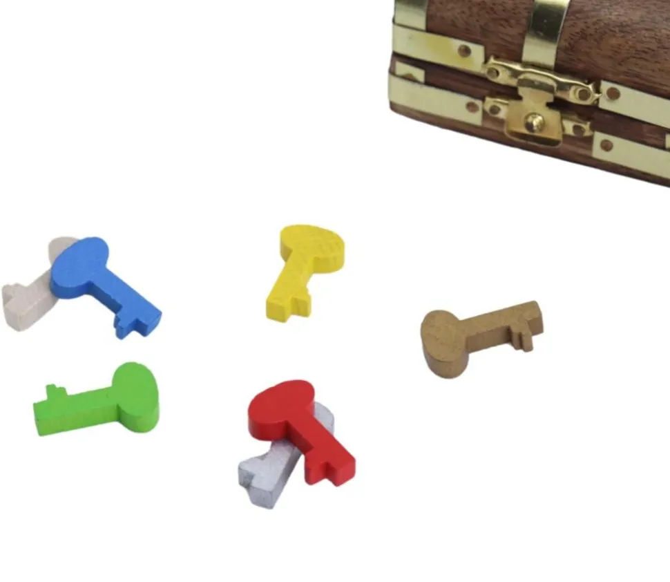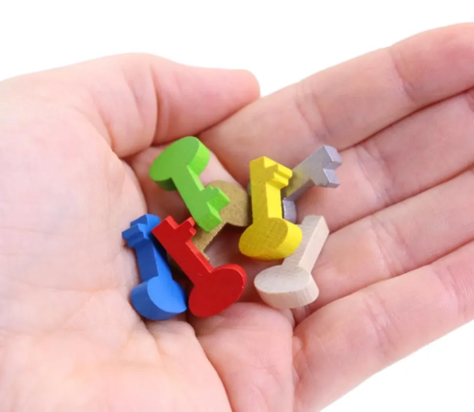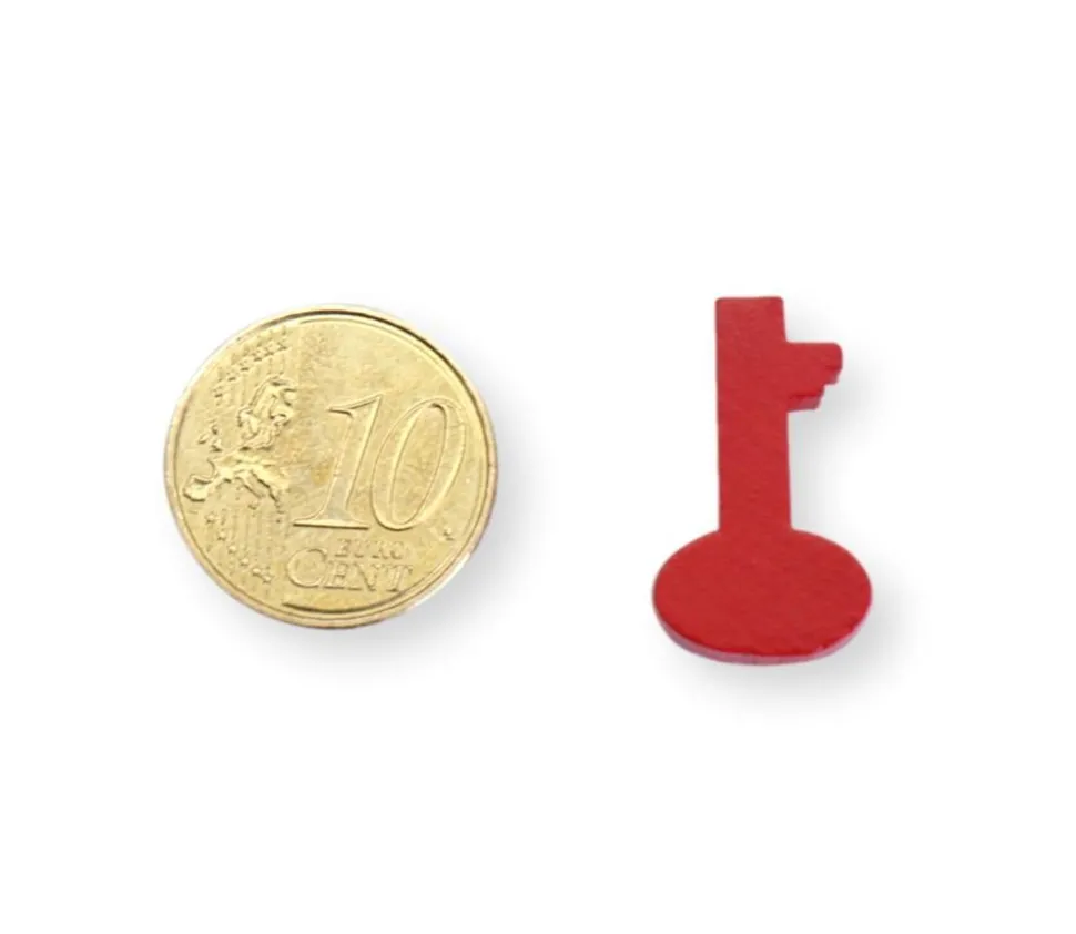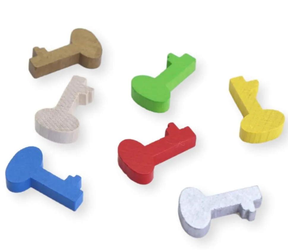 Pion de jeu en bois en forme de clé. Couleur de chaque unité à choisir parmi jaune, bleu, vert, rouge, doré, argenté ou naturel. Jeton pièce en bois en forme de petite clé teintée qui peut servir de pions, de récompenses dans vos jeux ou de jeton de remplacement pièces perdues. Accessoire pour loisirs créatifs et décorations.