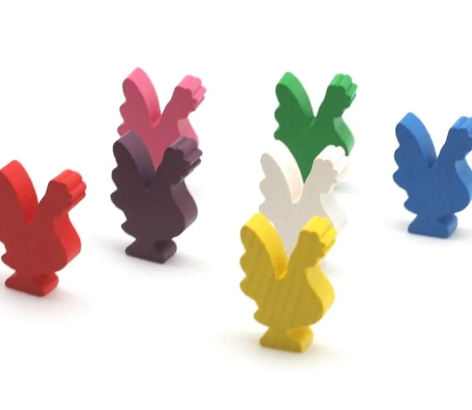 Pion coq coloré. Des pions en bois avec la forme des animaux de la ferme ou de la forêt, voilà de quoi créer de beaux jeux de société.
