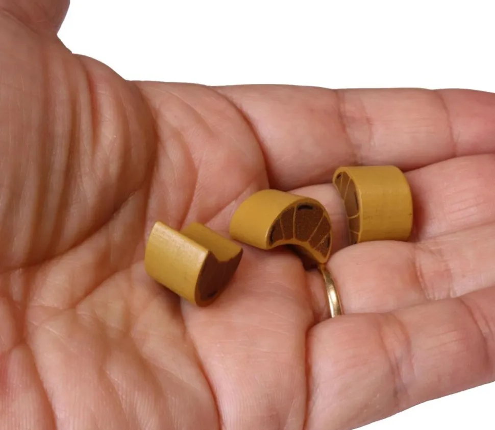 Mini croissant en bois. Dimensions : longueur 16 mm, largeur 10 mm, épaisseur 10 mm