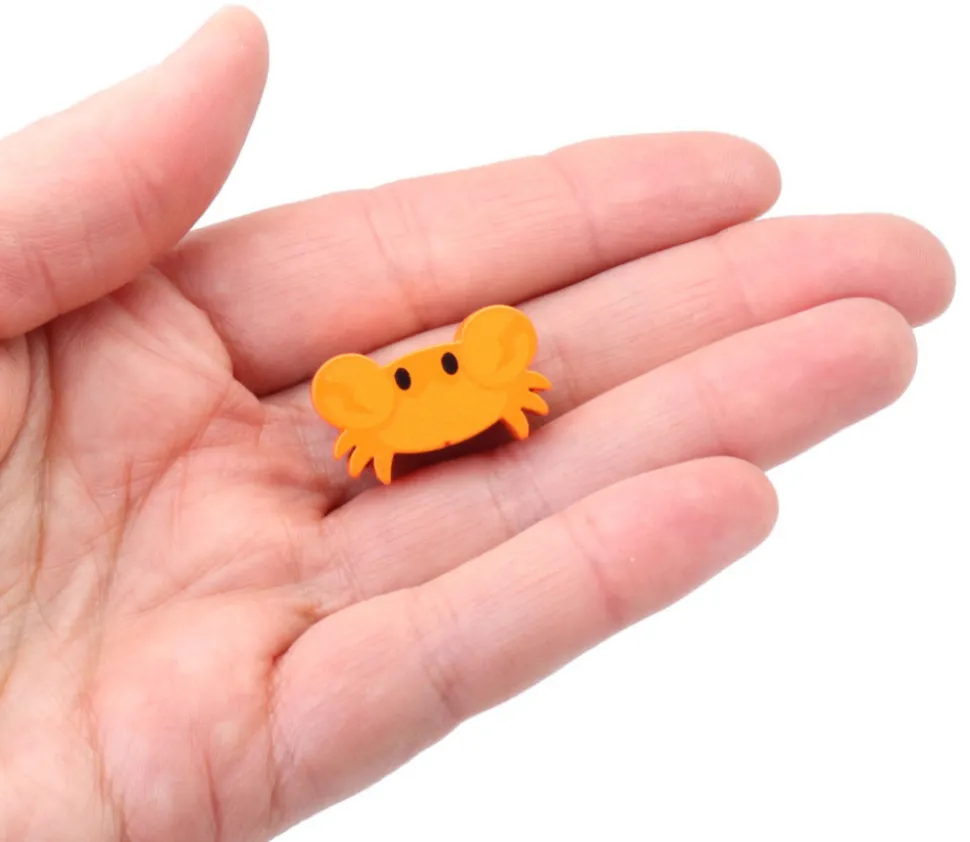 Pion de jeu crabe orange en bois. Petit jeton rigolo en forme de crabe. Impression décor des yeux et des pinces sur les faces recto et verso.