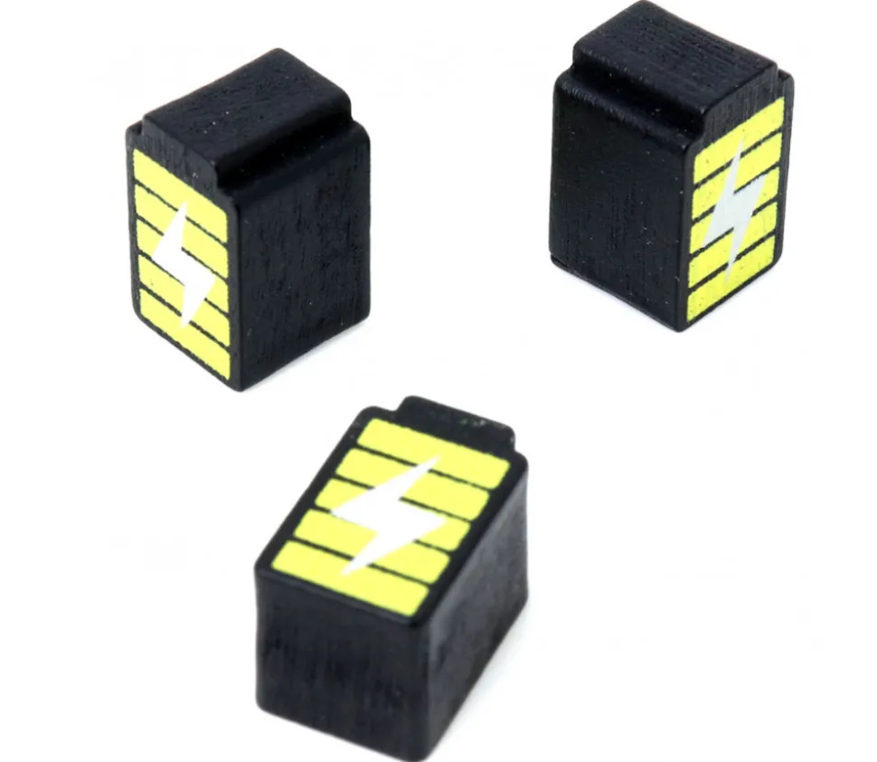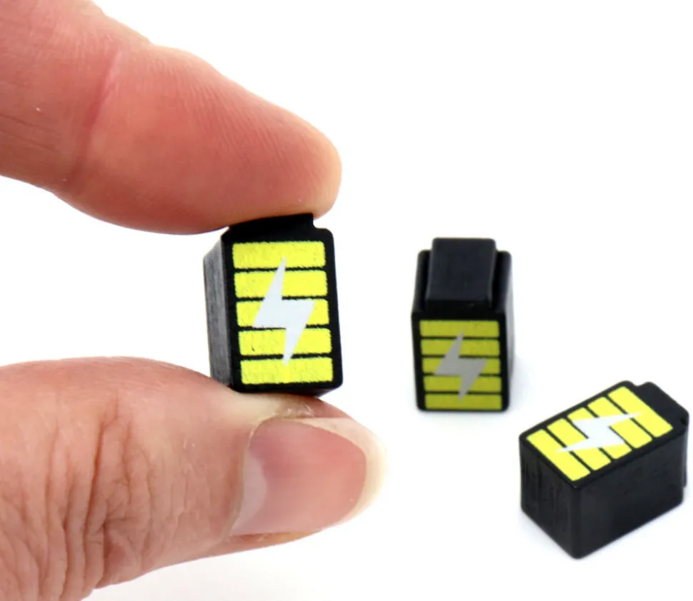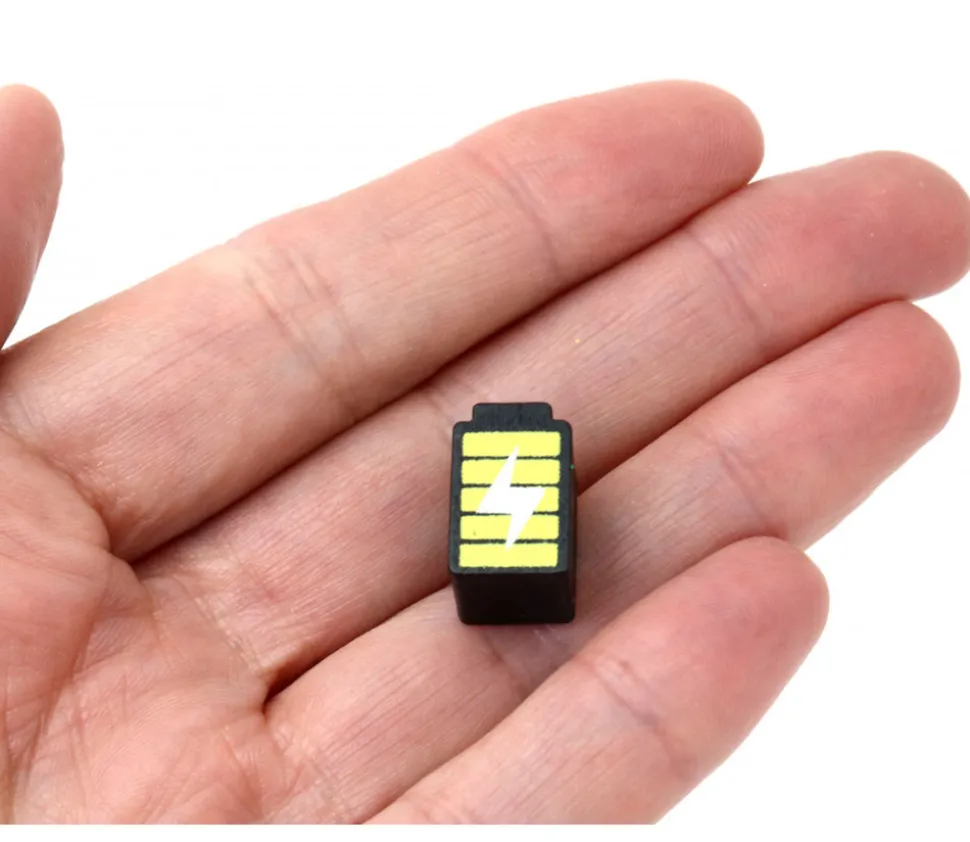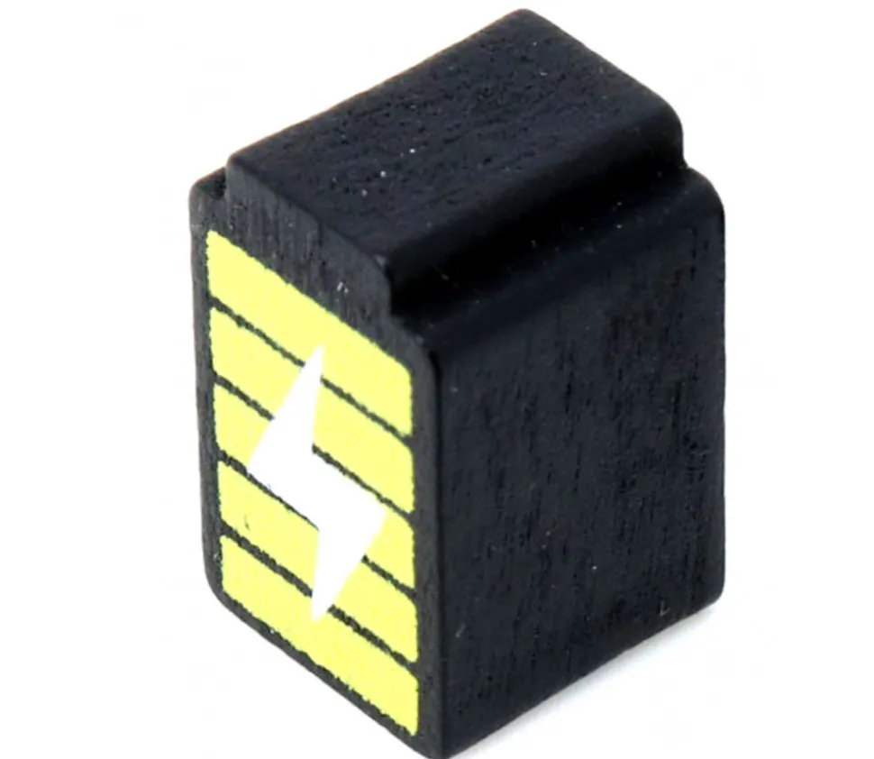 Jeton en bois 15 x 9 x 10 mm. Pion en forme de pile/batterie.