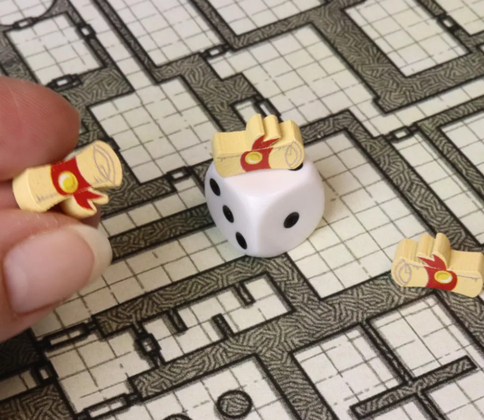 Pion de jeu en forme de rouleau de parchemin avec sceau en cire.