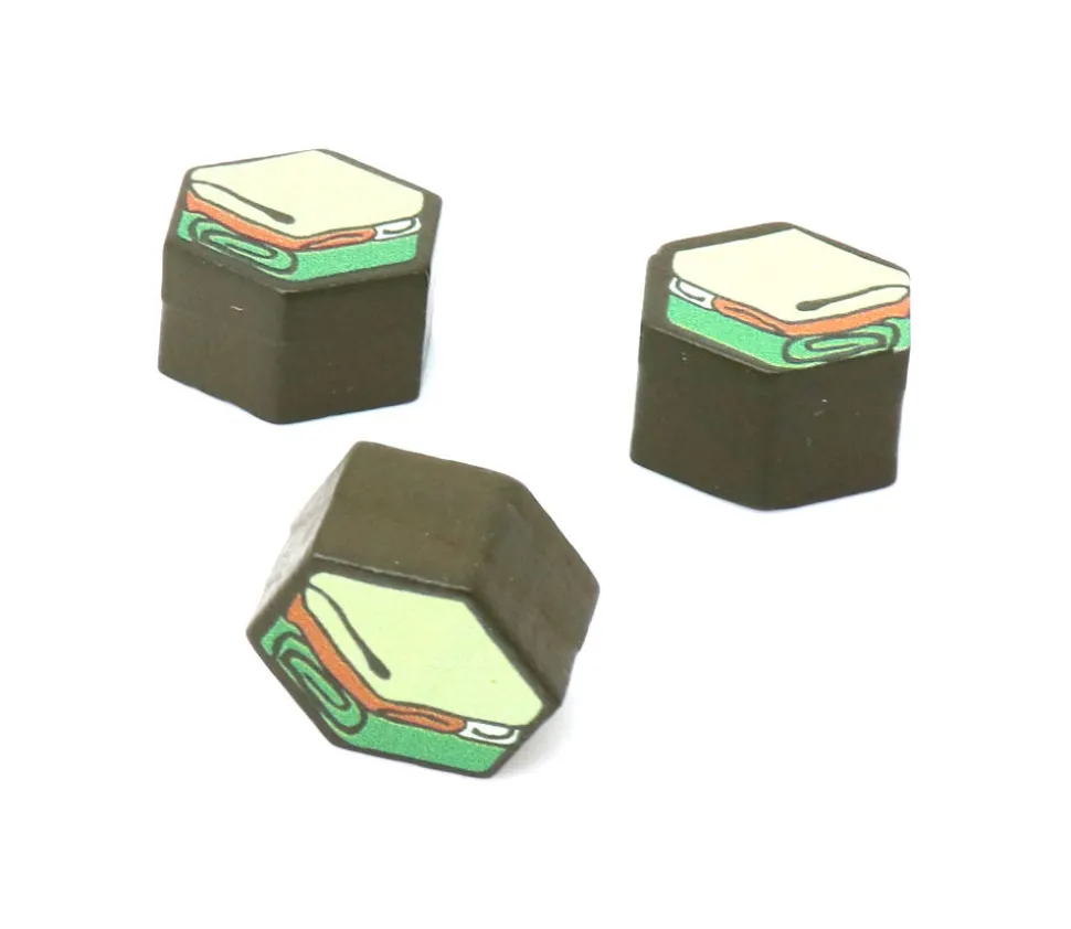 Jeton marron hexagonale d’environ 1.6 cm de diamètre et 1 cm d’épaisseur. Impression couleur jaune, rouge, vert et blanc sur les deux faces du jeton?