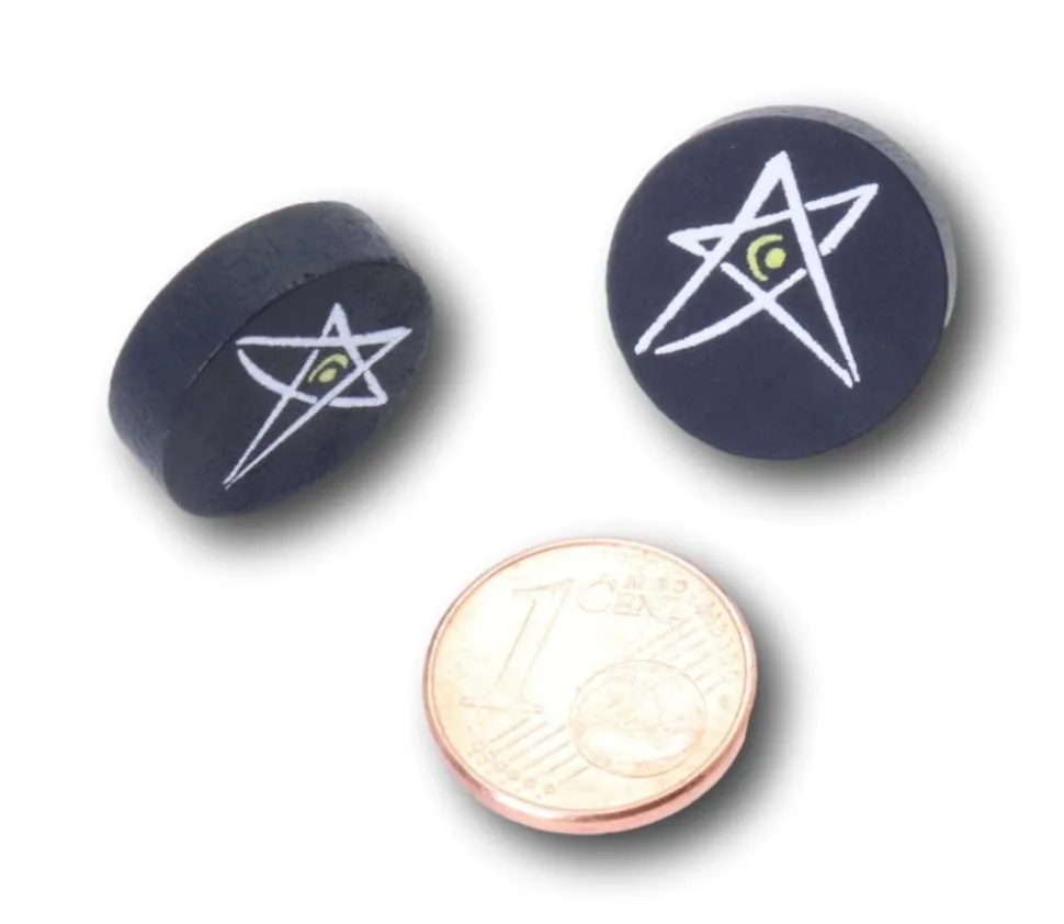 Pion disque noir en bois teinté avec un marquage recto et verso d’une étoile à 5 branches et une lune jaune.