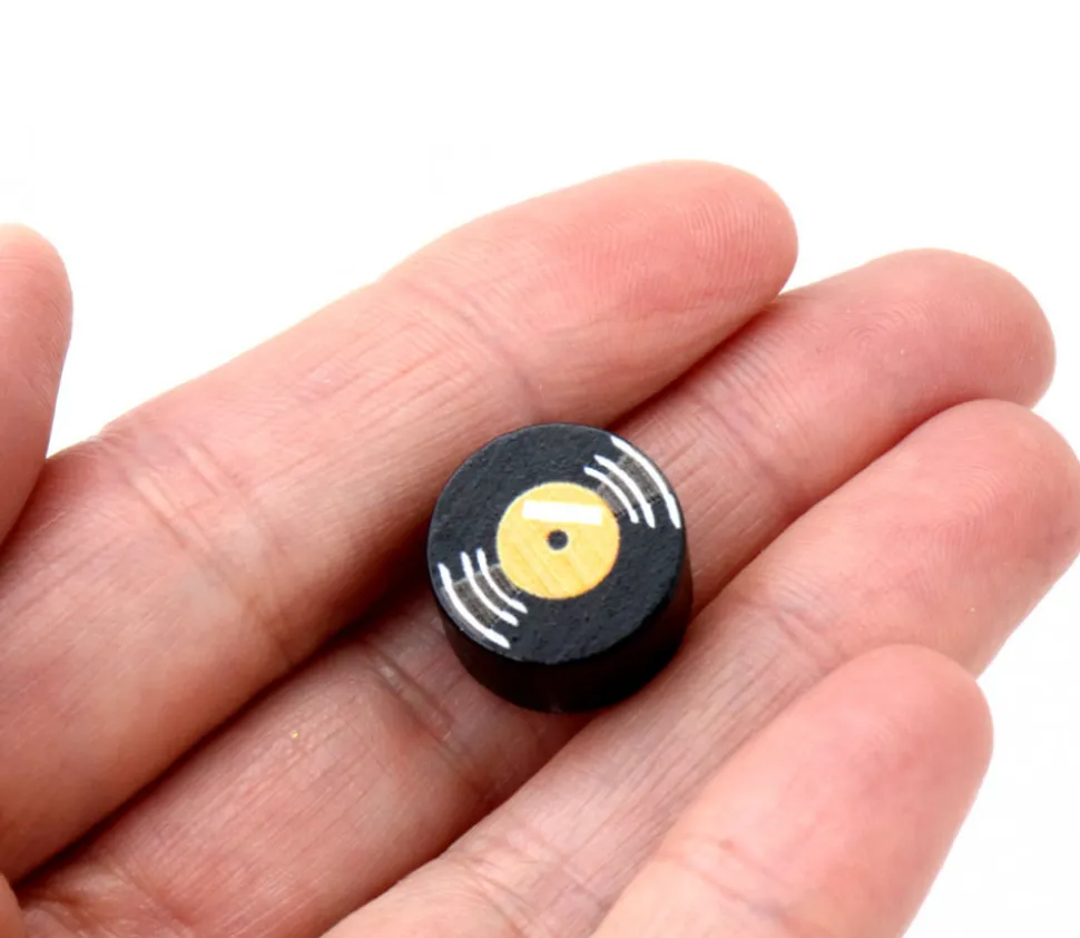 Miniature en bois en forme de disque vinyle noir.