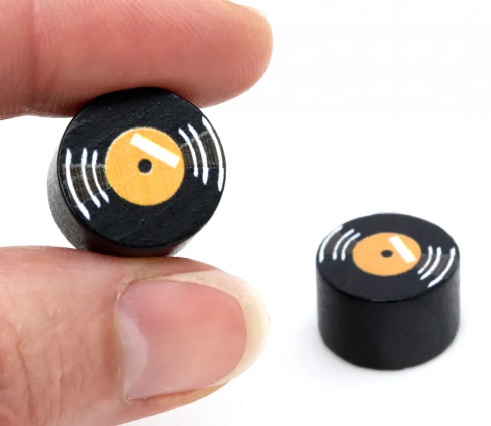 Pions en bois rond représentant un disque vinyle. Jeton pour les amateurs de musique.