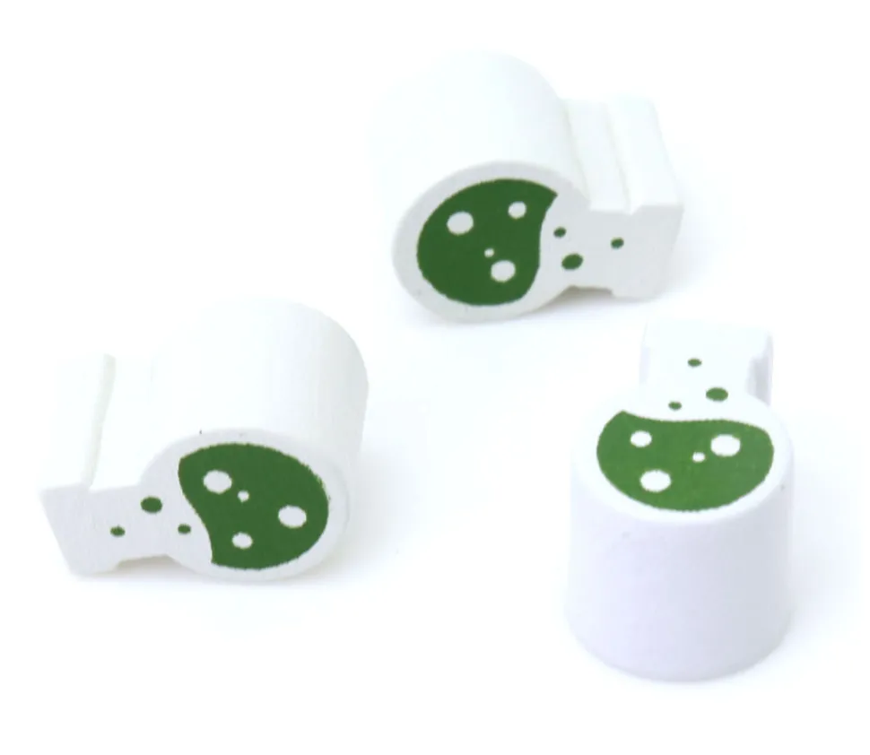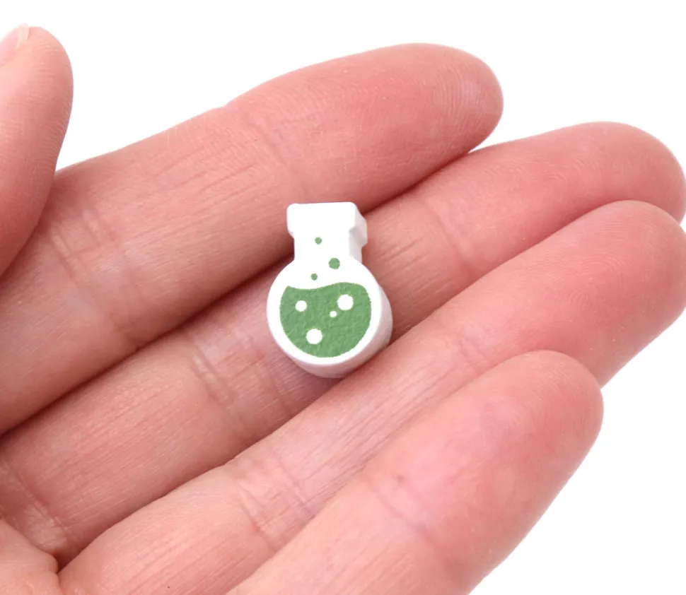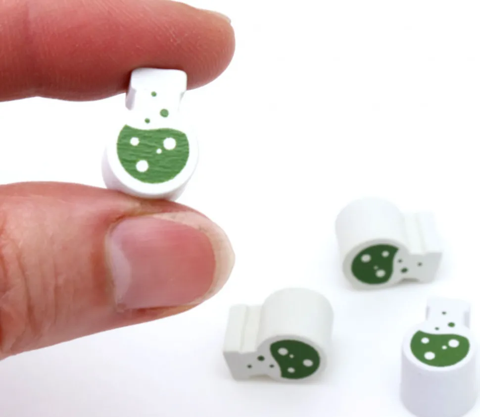 Pièce en bois teinté en blanc en forme de fiole avec une impression en vert sur le recto et le verso pour représenter un liquide qui fait des bulles.