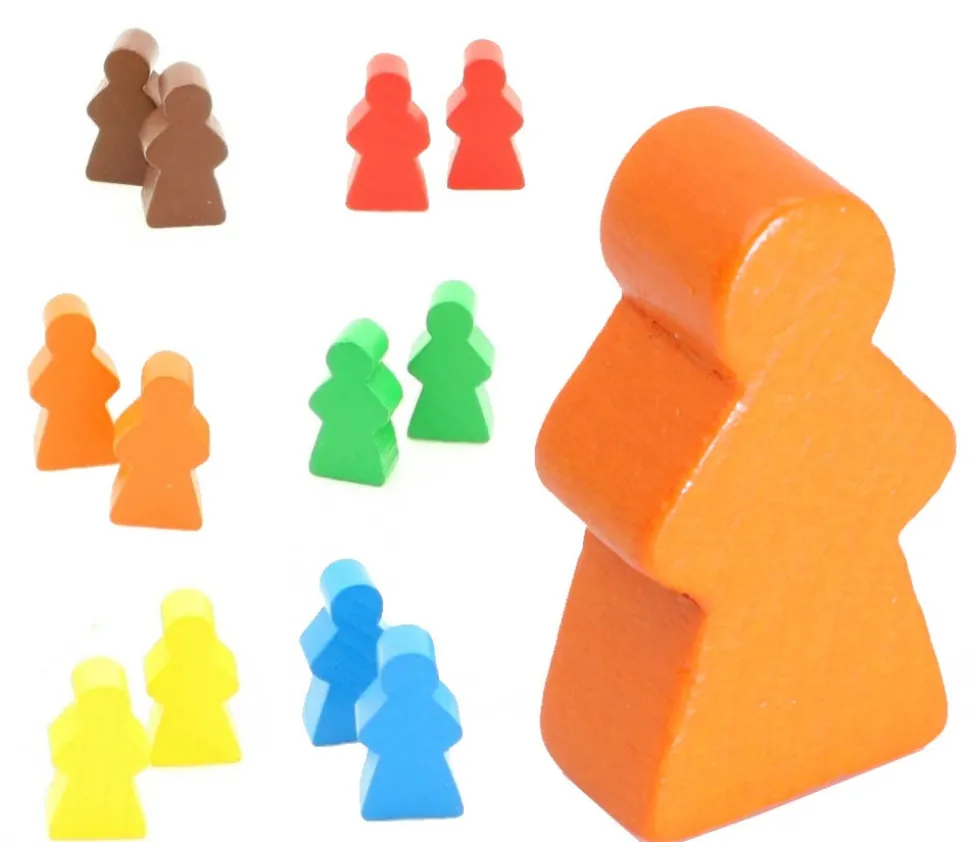 Pion meeple fille en bois. Pion personnages femme en bois de 2,3 cm de haut dans la même couleur. 6 couleurs disponibles : rouge, vert, jaune, bleu, orange et marron. Personnage fille en robe pour mélanger avec vos pions de jeux garçons (même taille).