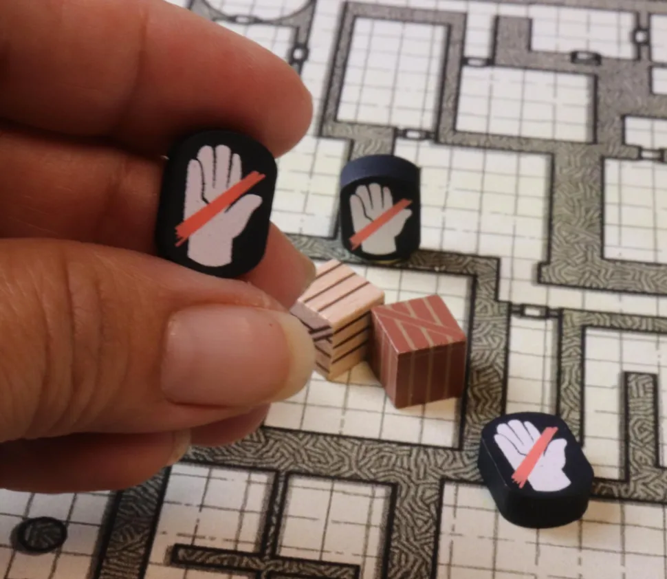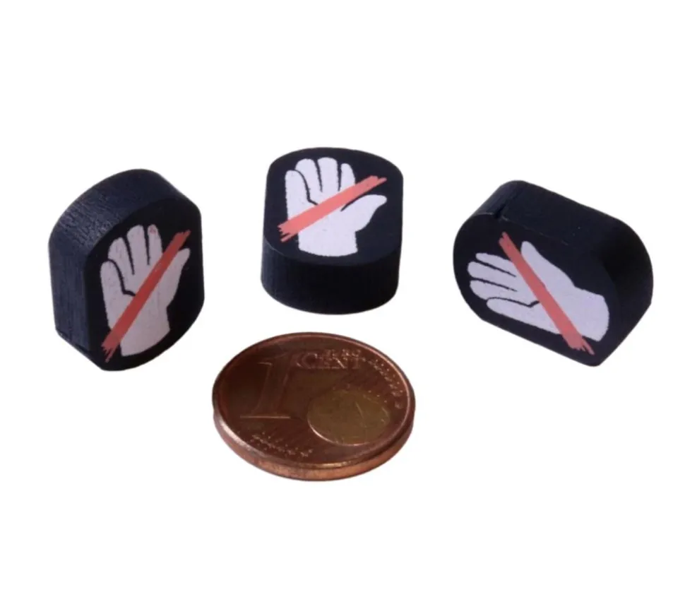 Pion Main en bois avec une face barrée. Symbole main désarmée, blessée, blocage, interdit de jouer pendant un tour, désavantage du joueur qui possède ce jeton..