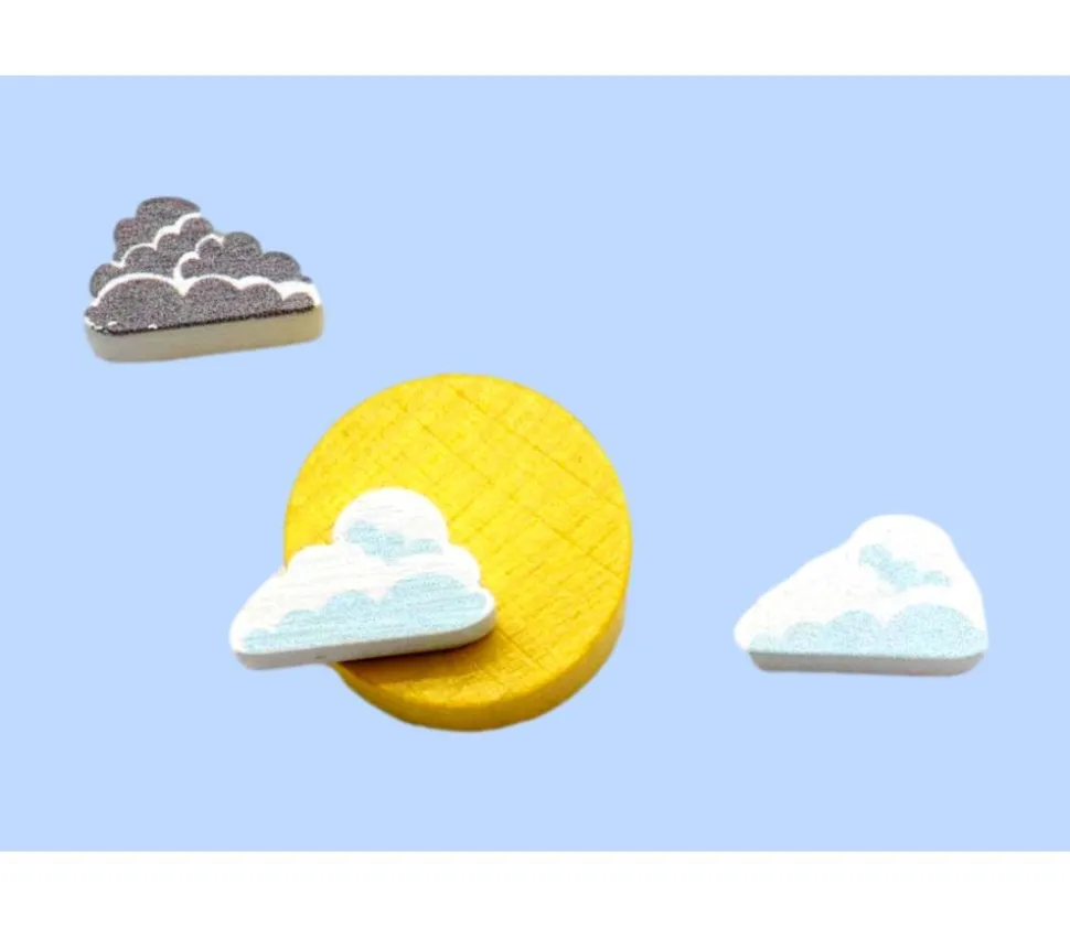 Quel temps fait-il ? Indique selon le coté du jeton, recto : nuage gris attention à la pluie ! nuage blanc et bleu clair au verso, il va faire beau !