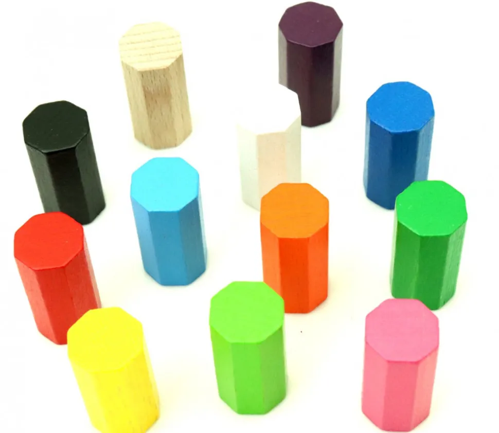 Pions octogonaux de 1.5 cm de diamètre et 3 cm de haut en bois. Pièces forme octogone utiles pour de nombreux jeux.