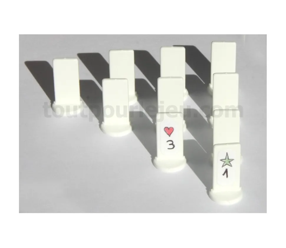 Créer vos propres personnages en collant des étiquettes sur les faces du pions de jeu. Base 15 mm et rectagnle de 12×28 mm.