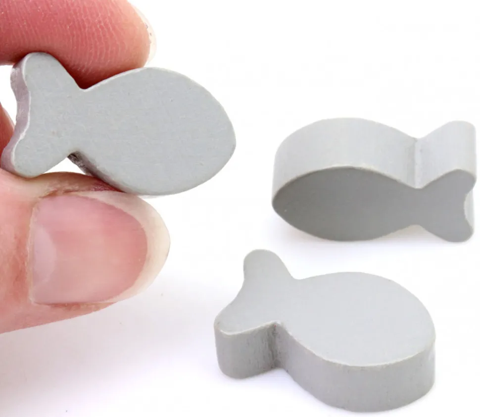 Pions de jeu gris en bois en forme de poisson pour créer des jeux sur le thème marin.