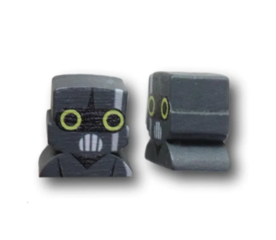 Jeton de jeu gris avec un dessin Robot imprimé en gris avec détails dessinés en noir, blanc, jaune sur les 2 faces du jeton.
