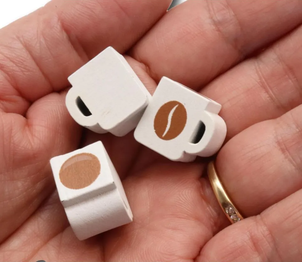 Petit pion peint en blanc avec un décor grain de café et sur le haut un point marron comme si le mug était rempli. Décor de maison de poupées, dinette ou jeton ressource pour un jeu de plateau. Pion rigolo pour un jeu de déplacement