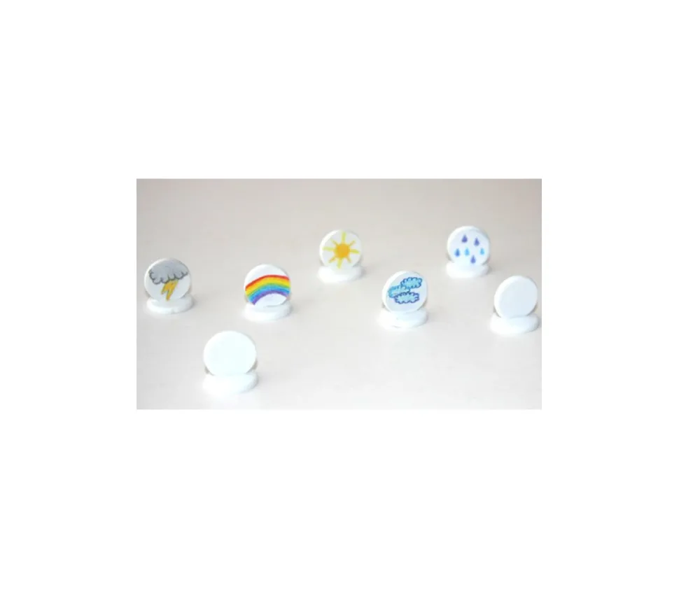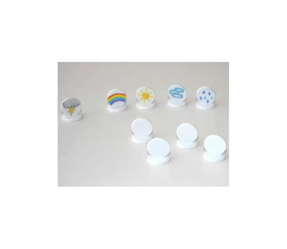 Pions de jeux à personnaliser ronds de 15 mm de diamètre. Support blanc que vous pouvez décorer avec des pastilles pour créer des pions avec le thème que vous souhaitez. Pion rond avec un socle arrondi et une face plane à la verticale pour la personnalisation. Vente par lot de 10 supports.