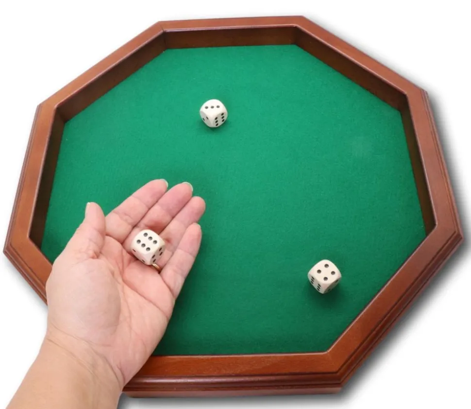 Piste à dés octogonale en tilleul verni et teinté de 38 cm de diamètre. L’intérieur de la piste est recouvert d’une feutrine verte, le dessous de la piste également. Cette piste pour jouer à de nombreux jeux de dés est livrée avec 3 dés de 16 mm en bois d’érable.