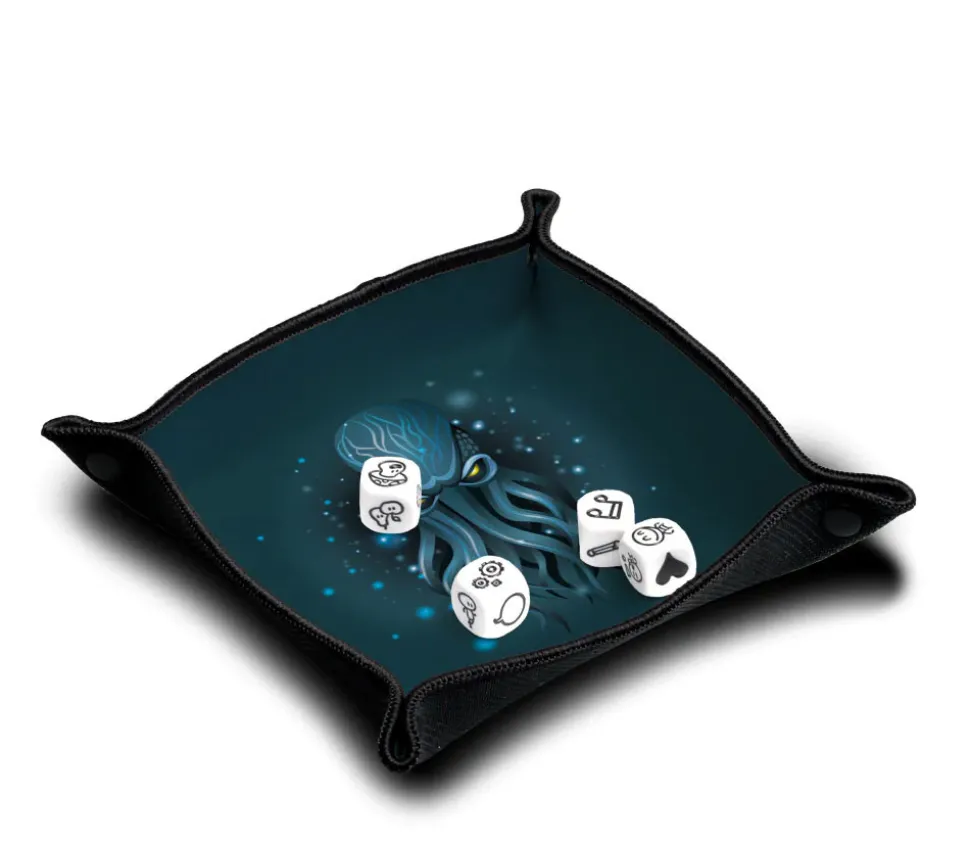 Petite piste de dés à jouer souple dans les tonalités bleu-gris avec le dessin de la pieuvre Chtulhu.