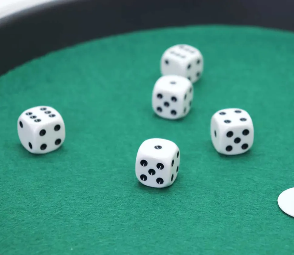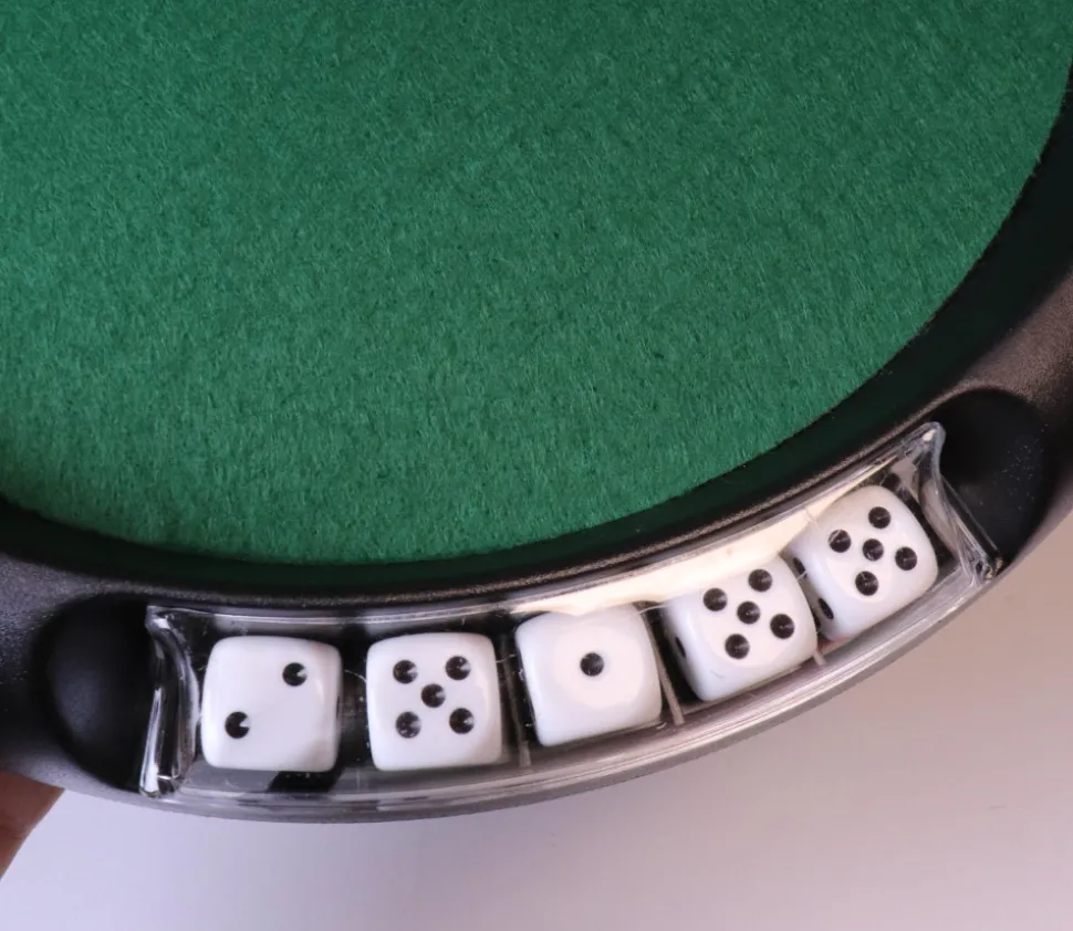 Piste de dés à jouer 33 cm de diamètre. Piste de jeu livrée avec 5 dés et des jetons pour miser sur vos parties de jeux de 421, yams ou autres jeux de dés à jouer.