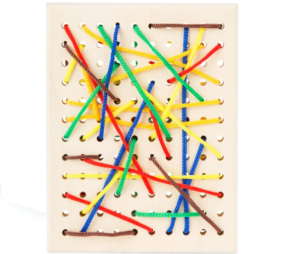 Planche en bois à trous. Jeu de laçage pour les enfants.
