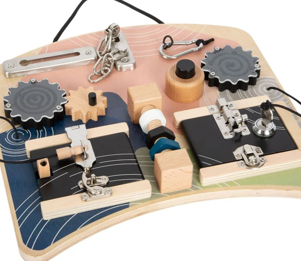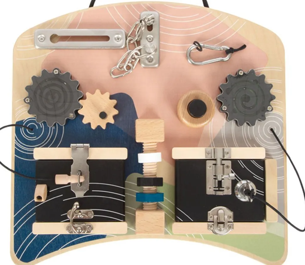 Planche de motricité pour les enfants avec serrures et engrenages.