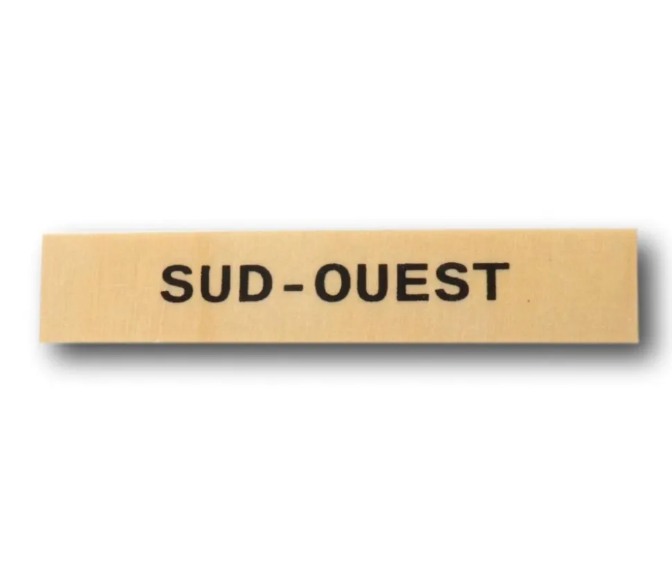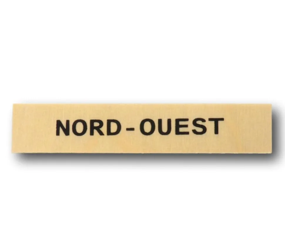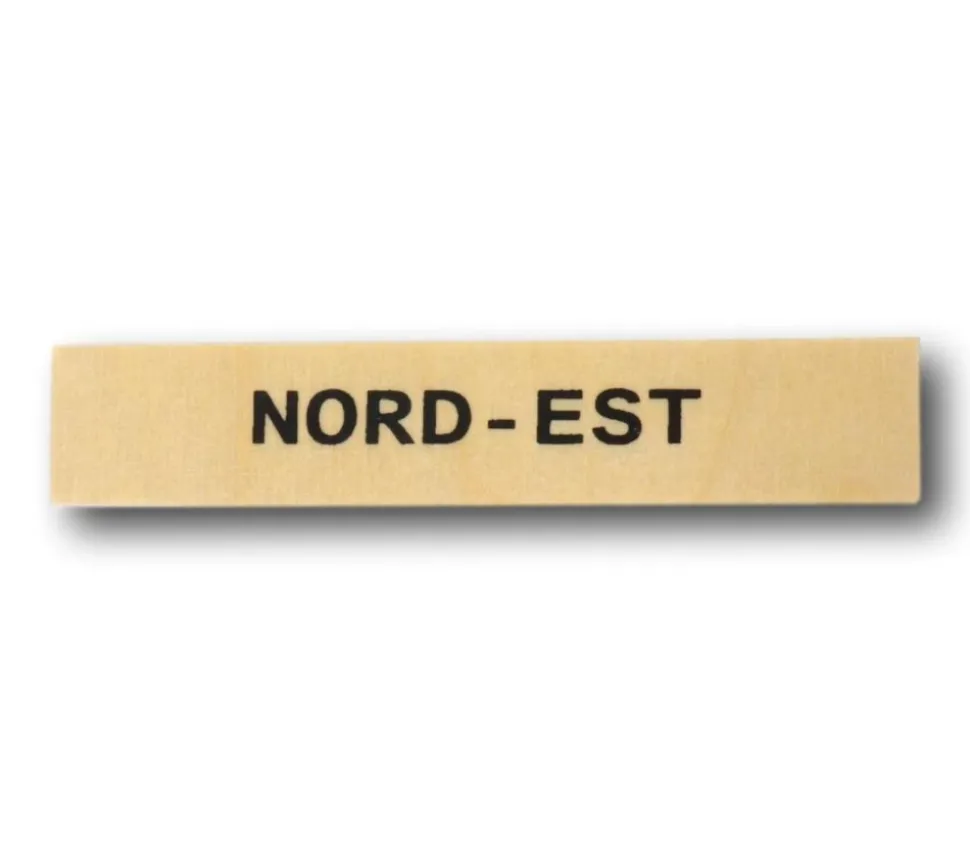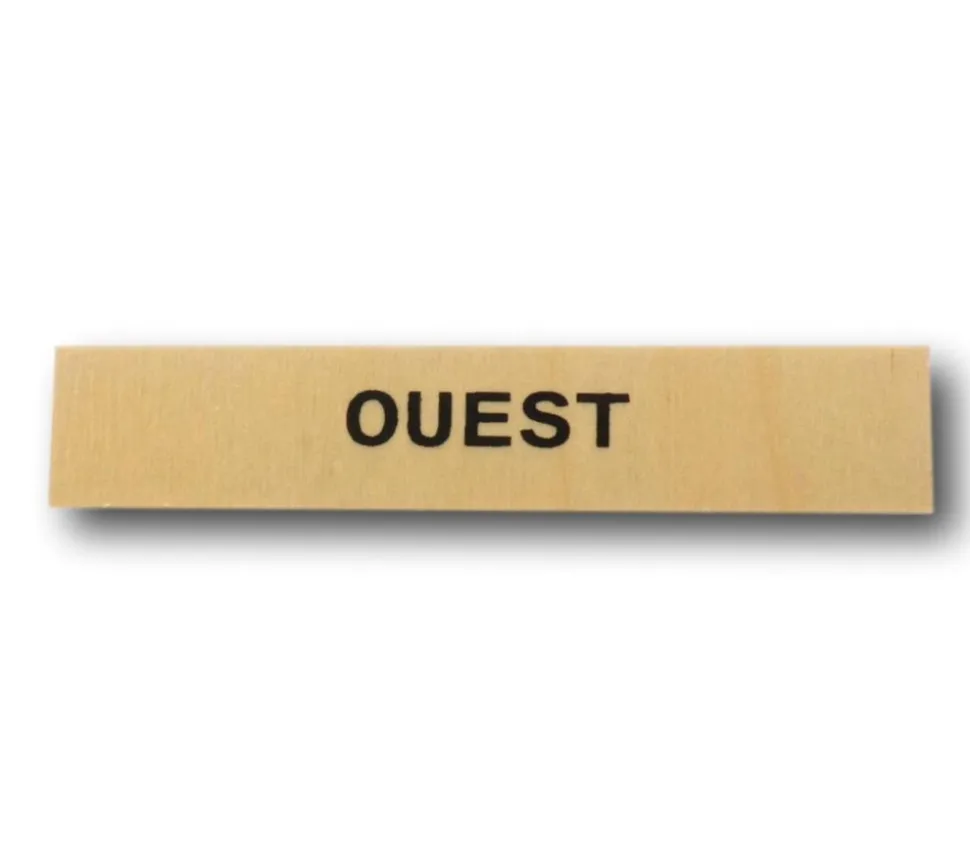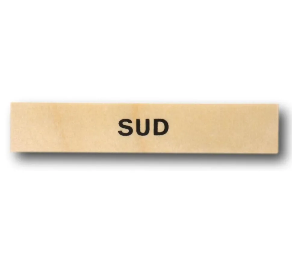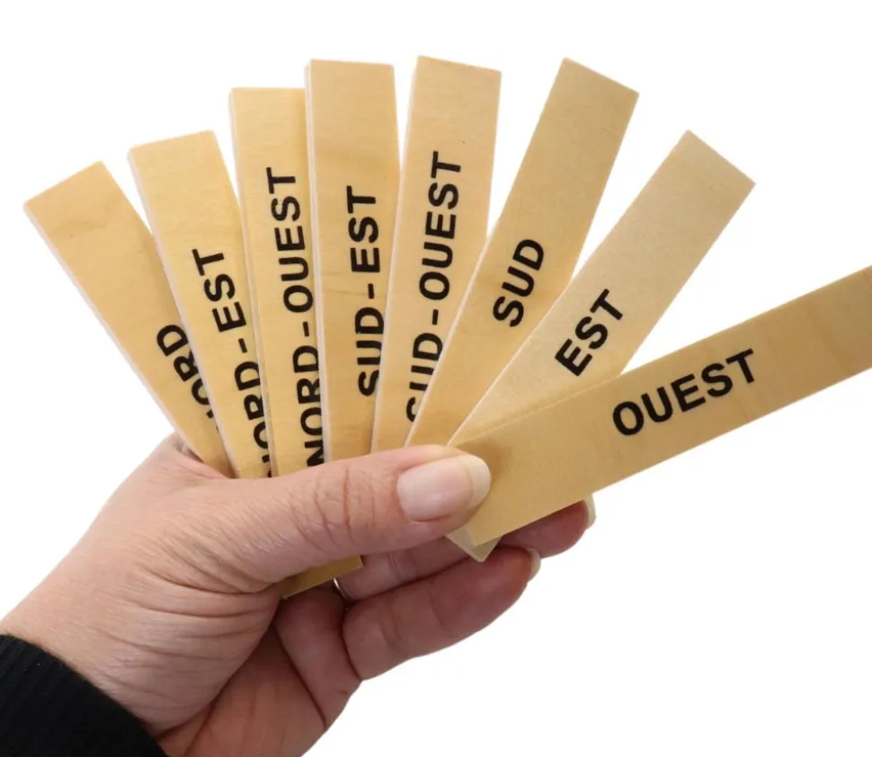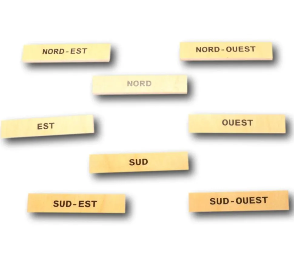 Points cardinaux Nord, Sud, Est, Ouest, Sud-Est… inscrit sur une plaquette en bois rectangulaire en CP bouleau verni