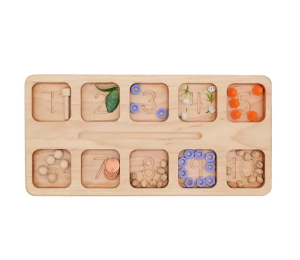 Plateau tableau en bois pour aider les enfants à développer leur compétences en mathématiques et leur compréhension des nombres. Le plateau se composer de 10 emplacement avec les chiffres gravés au fond de 1 à 10. Ces cases petits compartiments permettent d’y déposer des petits objets ou des petits cubes ou jetons pour le comptage que vous pouvez acheter séparément sur notre site.