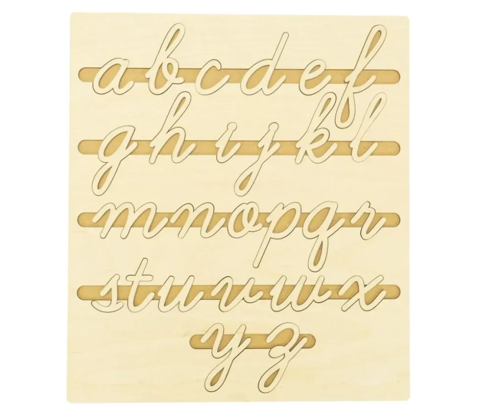 Puzzle en bois avec les 26 lettres de l’alphabet à encastrer. 26 pièces en bois en formes de lettres cursives. Jeu éducatif pour apprendre en s’amusant la forme des lettres aux plus petits. Puzzle d’apprentissage des lettres de style d’écriture manuscrite où ce sont les lettres qui forment les pièces du puzzle et qui sont à encastrer sur un plateau.