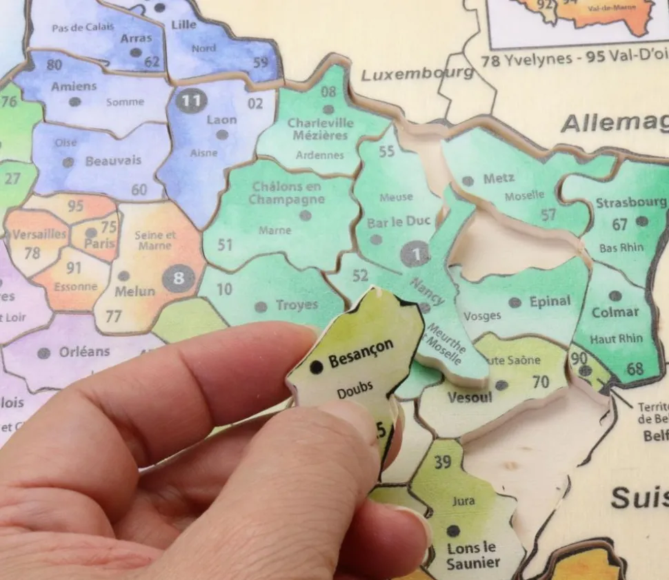Un joli puzzle de la France pour apprendre la géographie française en s’amusant. Des pièces faciles à manipuler et emboiter pour les enfants.
