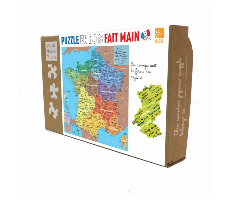 Très joli puzzle en bois enfant de 24 pièces thème des régions de France. Très beau puzzle tout en bois avec de belles couleurs. Chaque région a sa couleur et on apprend la géographie de la France en s’amusant. Découpage des régions, des départements.