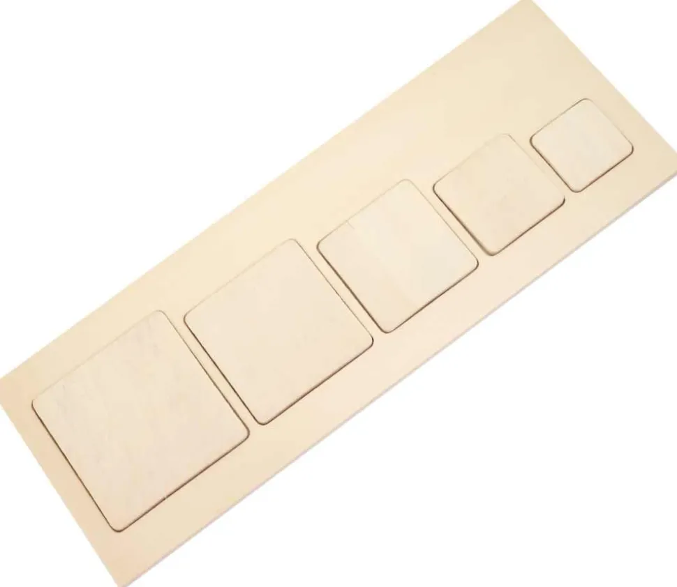 Grand plateau en bois naturel avec 5 emplacements troués de forme carré du plus petit au plus grand. Positionner les 5 carrés par ordre croissant.