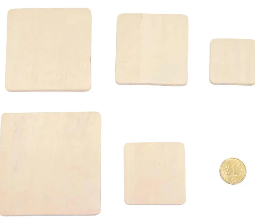1 grand plateau en bois de 33 x 12 cm avec 5 carrés bois naturel de tailles différentes.