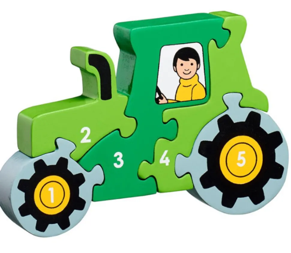 Puzzle en bois tracteur Lankakade d’hévéa avec 5 grosses pièces numérotées de 1 à 5 à encastrer. Puzzle bois véhicule avec les chiffres de 1 à 5 à positionner dans le bon ordre pour obtenir un beau tracteur. Tracteur avec un petit personnage fermier par la fenêtre.