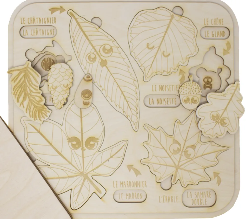 Puzzle éducatif en bois de bouleau pour stimuler la représentation des feuilles, bogues et fruits de l’enfant.