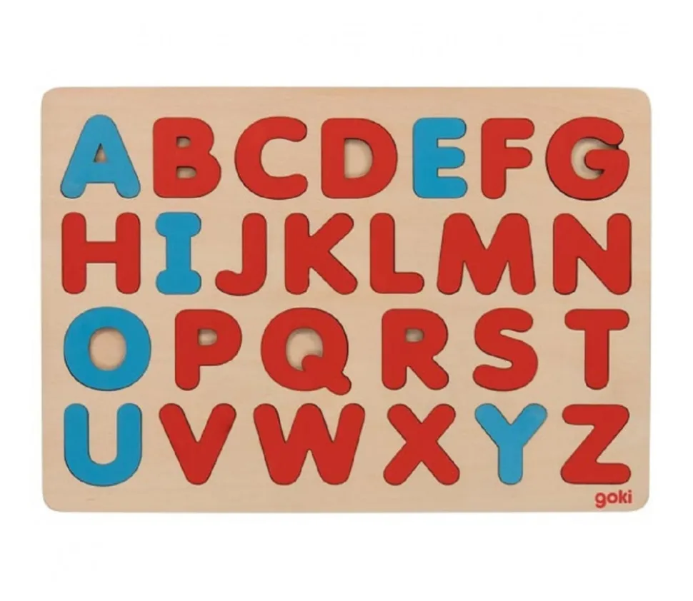 Puzzle en bois Goki Lettres de l’alphabet couleurs méthode Montessori comprenant :
