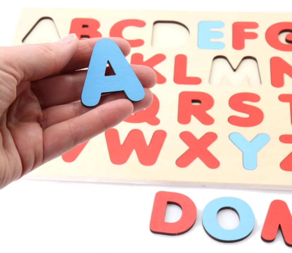 Puzzle en bois avec les 26 lettres de l’alphabet à encastrer. 26 pièces en bois aux couleurs de la méthode Montessori : voyelles bleues et consonnes rouges. Jeu éducatif pour apprendre en s’amusant la forme des lettres aux plus petits. Puzzle d’apprentissage des lettres avec de belles pièces en forme de lettres à encastrer sur un plateau.