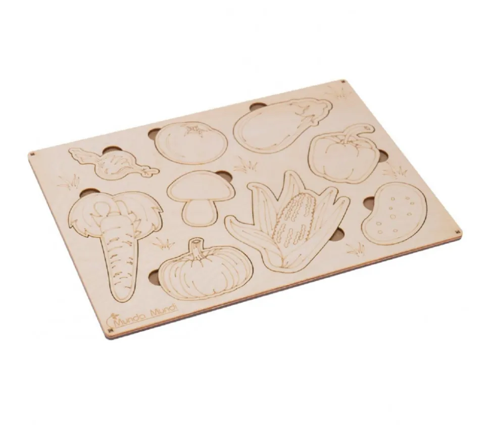 Puzzle en bois 2 jeux en un : reconnaitre et trouver l’emplacement des légumes et les colorier pour décorer les pièces.