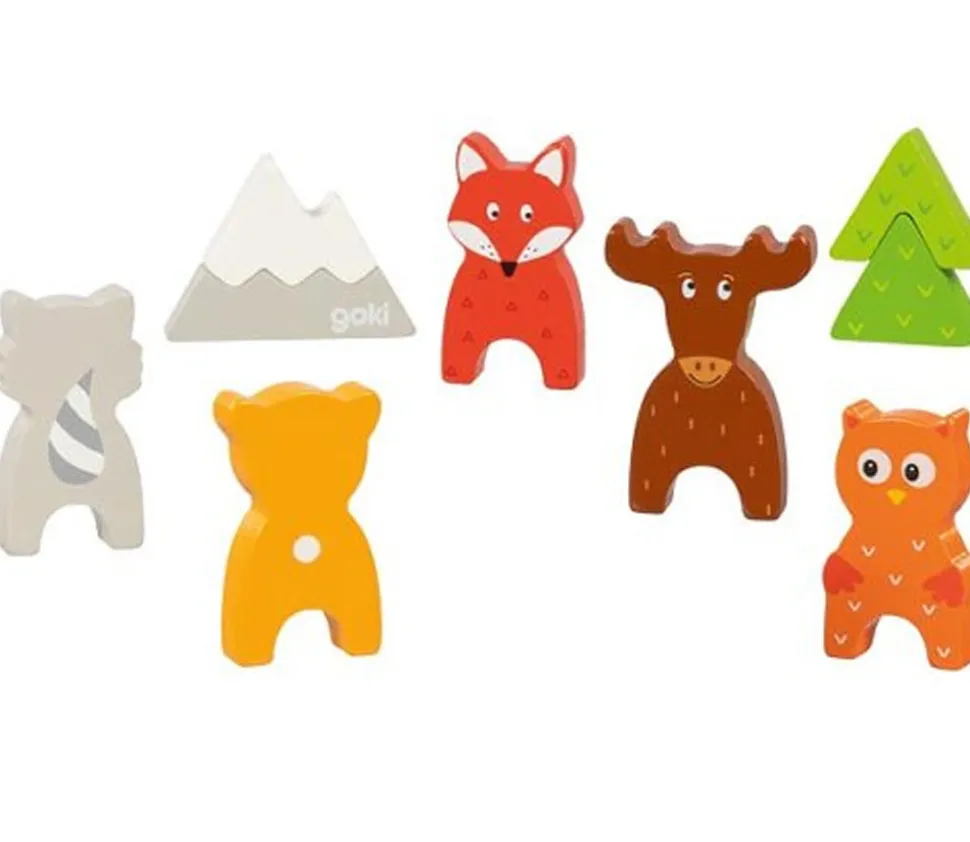 Jouet en bois coloré de très belle qualité qui donne envie de jouer aux enfants : renard, raton-laveur, hibou, ours, sapin et montagne.