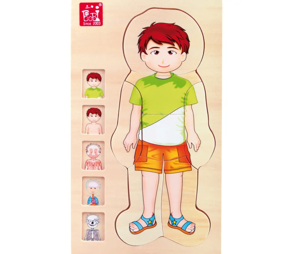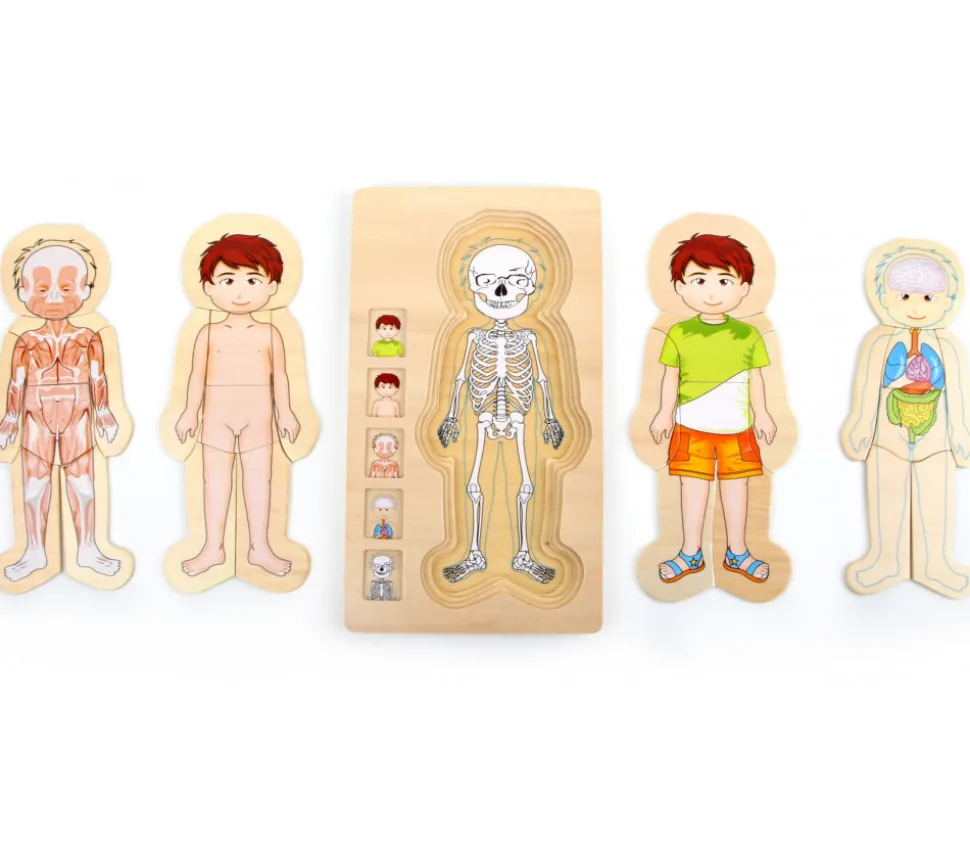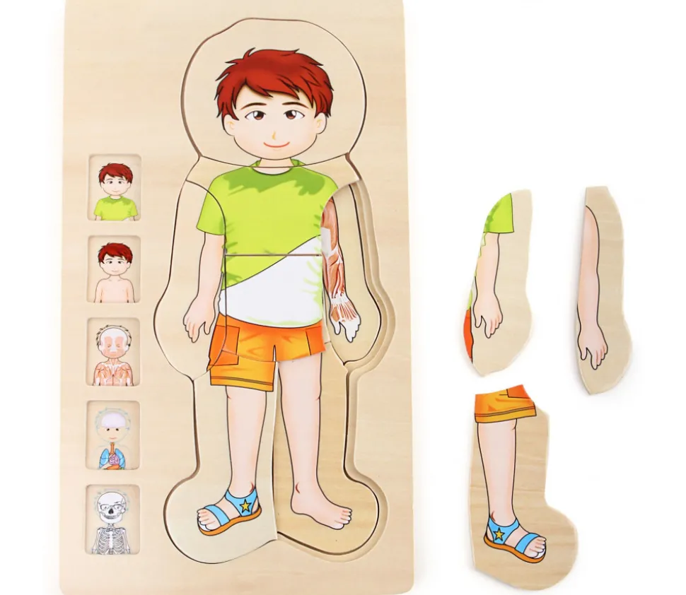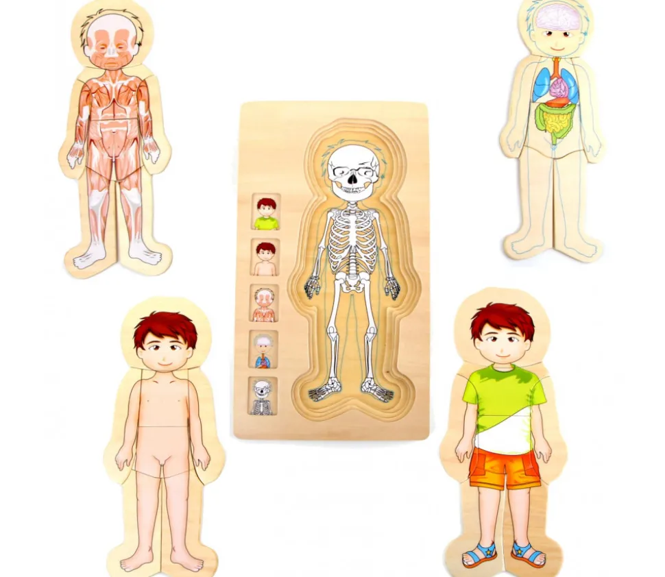 Plateau en bois avec 4 puzzles à étage à reconstituer sur l’anatomie du garçon. Reconstituer le personnage sous différentes formes pour bien identifier les différentes parties du corps. 28 pièces de puzzles. Dimensions : 29 x 16.6 x 2 cm. Super jeu éducatif pour apprendre et comprendre l’anatomie de l’être humain. Décomposition des parties, découverte des organes, muscles…