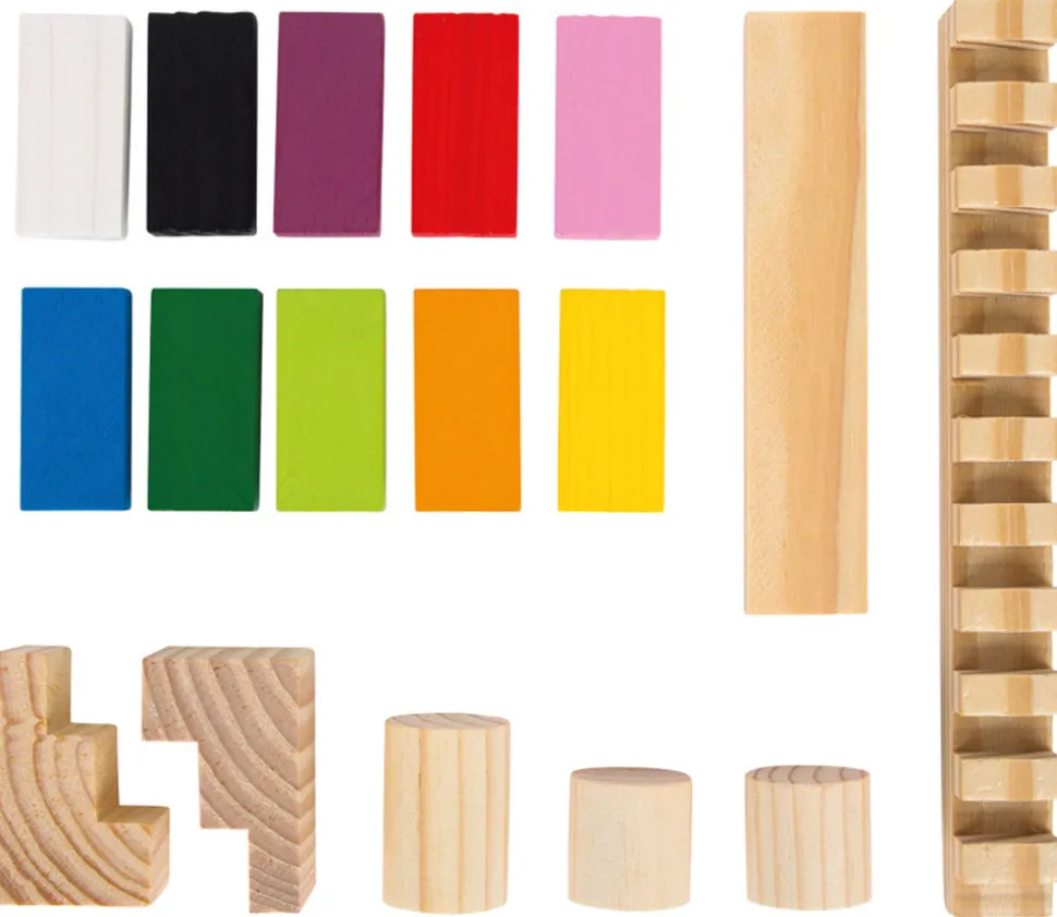 Jeu de dominos rallye et cascade avec des belles pièces en bois multicolores et des accessoires (pont et escalier)