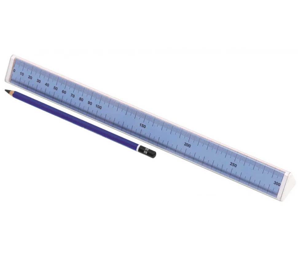 Outil d’aide pour apprendre les conversions des unités de longueur en mathématiques. Règle spéciale pyramidale avec 3 faces : une pour chaque unité de longueur.