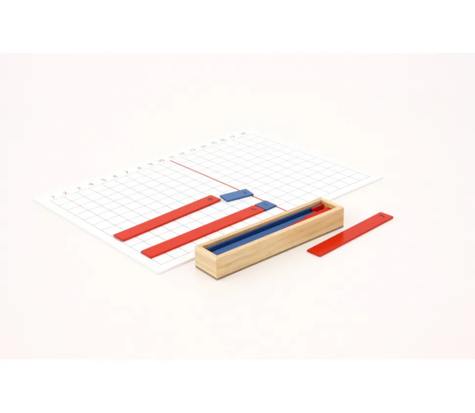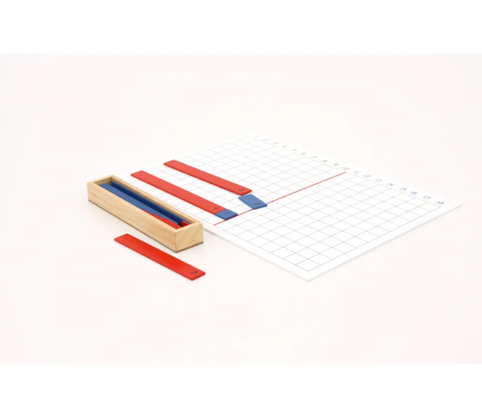 Matériel pour addition méthode Montessori. Set avec 18 réglettes numérotées en 2 couleurs, tableau de calcul et coffret de rangement pour les réglettes.
