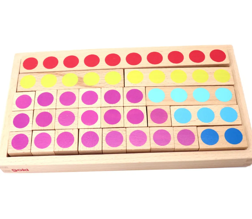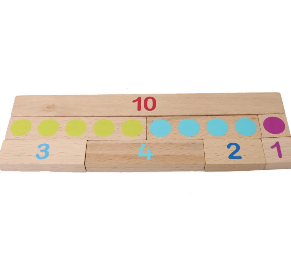 Jeu éducatif en bois naturel (hêtre). Jeu avec pièces en bois chiffres et points. Matériel en bois résistant pour manipuler, classer les chiffres, comprendre et apprendre leur valeur. Escalier de 10 bâtons rectangulaires en bois.