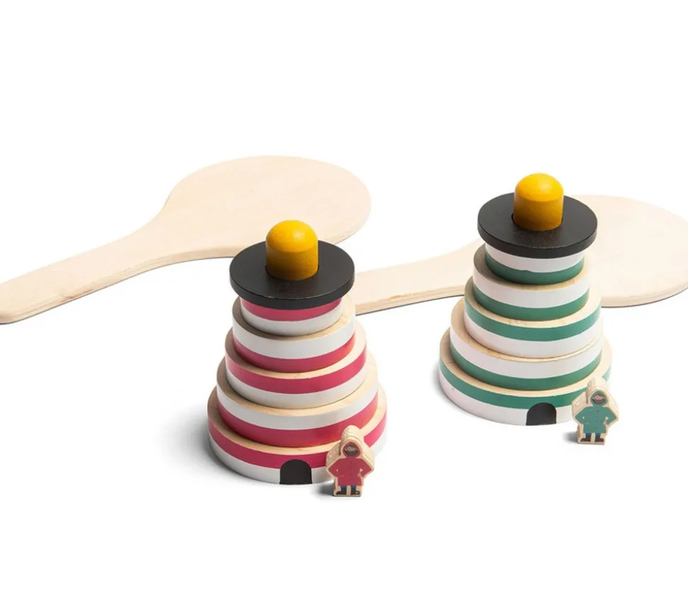 Jeu en bois collectif de relais. Super jeu avec des raquettes en bois sur lesquels on va construire des phares en essayant de ne pas les faire tomber.