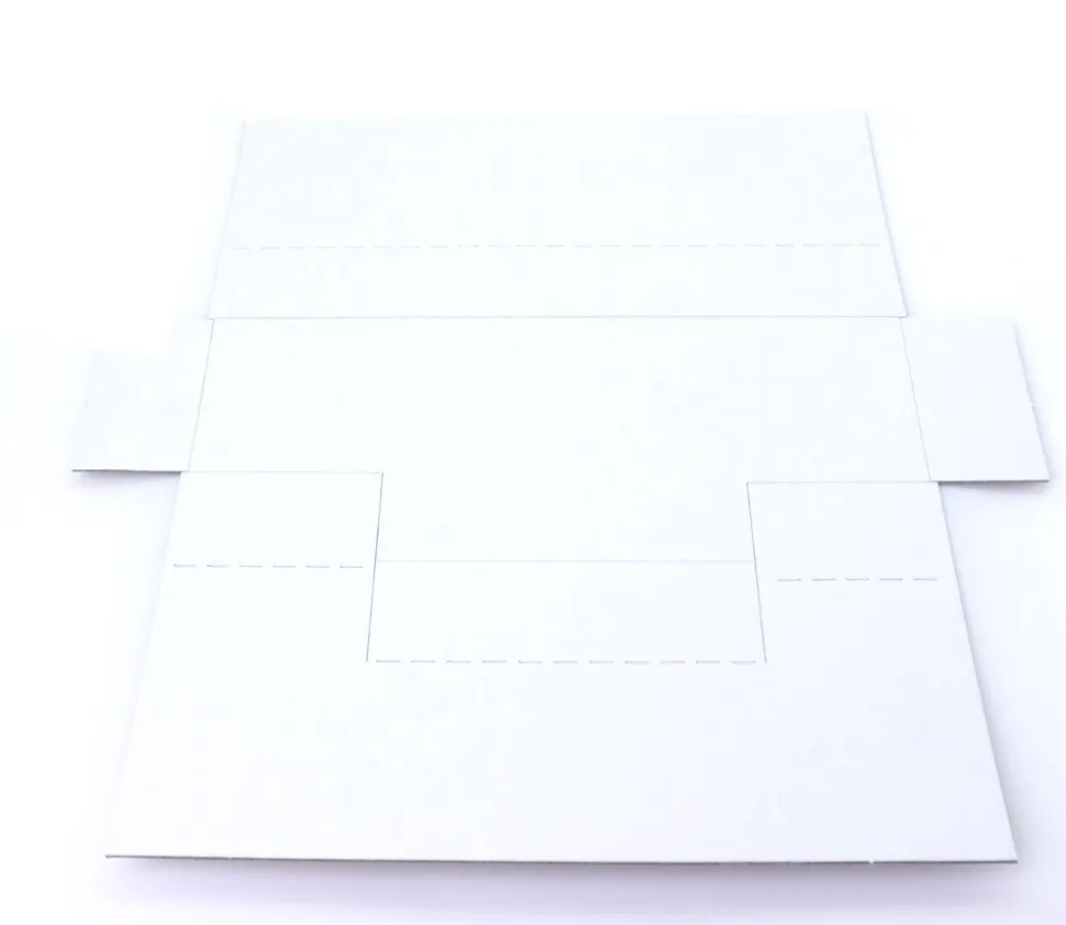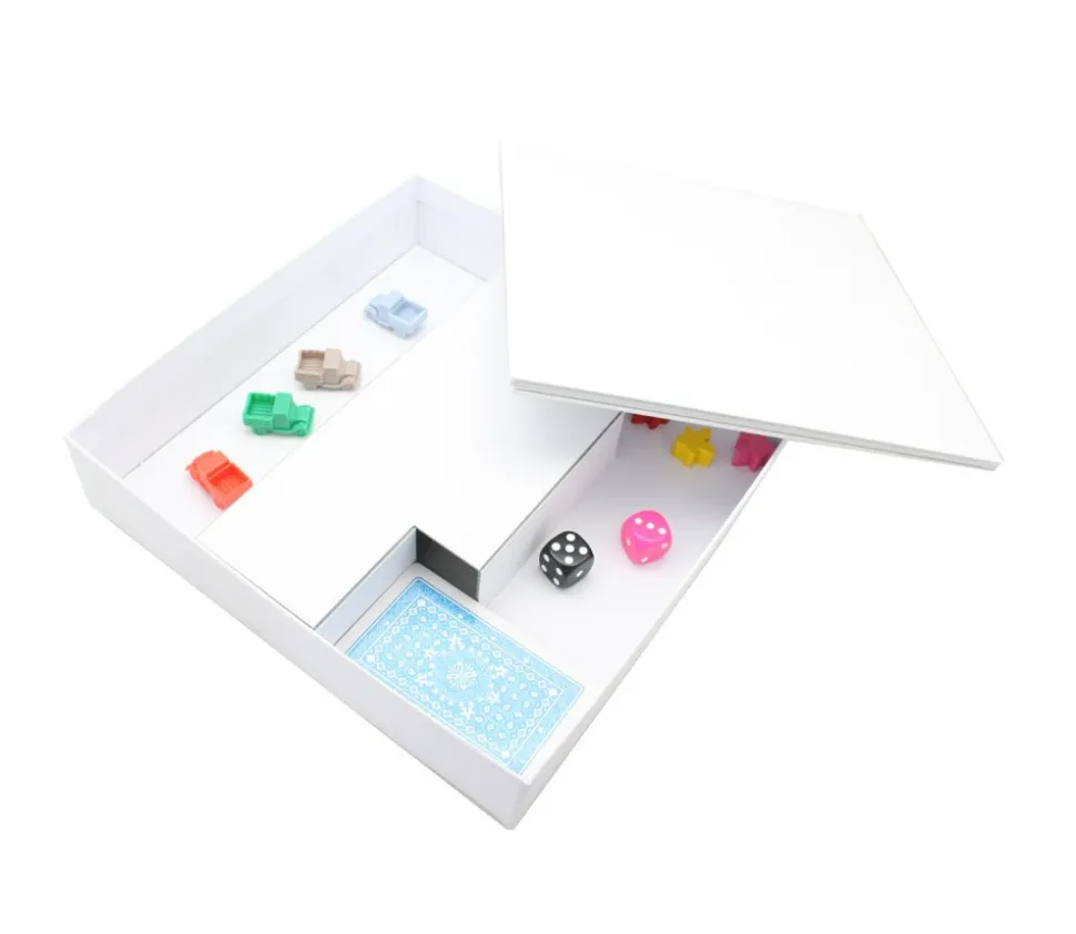 Support en carton blanc avec prédécoupage. Livré à plat. Sabot intérieur pour rangement avec 2 grandes zones. Une zone rectangulaire et une zone en forme de pont pour caler 2 jeux de cartes à jouer sur les côtés par exemple.