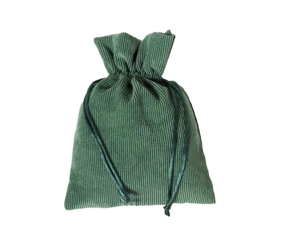 Cordon vert pour fermer par serrage. On tire sur les ficelles et le pochon se ferme facilement.